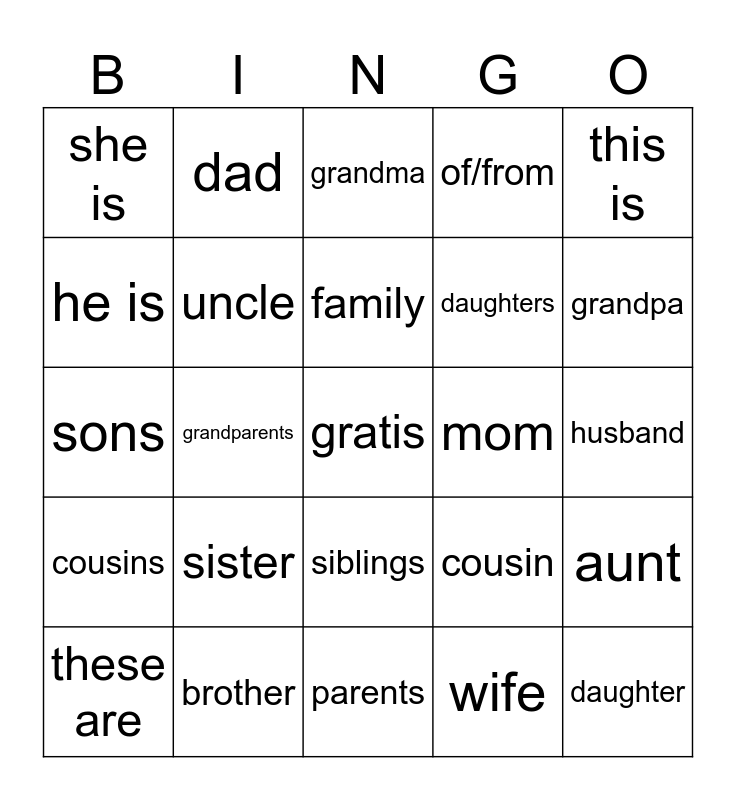 This bingo card has a free space and 24 words: sister, brother, family, these are, this is, she is, he is, dad, mom, siblings, daughters, sons, cousin, aunt, uncle, wife, husband, grandma, grandpa, grandparents, daughter, cousins, of/from and parents.