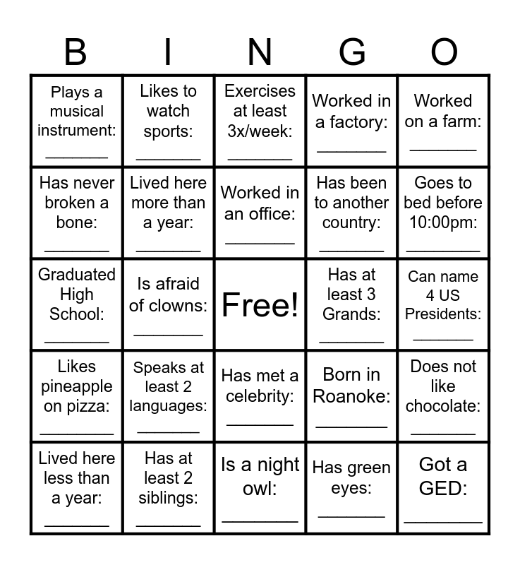 This bingo card has a free space and 44 words: Born Outside of Virginia: _______, Speaks at least 2 languages: _______, Is afraid of spiders: _______, Has green eyes: _______, Is an only child: _______, Has never had a beer: _______, Lived here more than a year: _______, Is a morning person: _______, Worked in a factory: _______, Got a GED: _______, Plays a musical instrument: _______, Has at least 2 siblings: _______, Born in Roanoke: _______, Can name 4 US Presidents: _______, Has 2 or more children: _______, Likes soap operas: _______, Is a night owl: _______, Has at least 3 Grands: _______, Favorite color is red: _______, Graduated High School: _______, Likes to watch sports: _______, Has met a celebrity: _______, Played a sport in school: _______, Worked on a farm: _______, Has been to a rock concert: _______, Has visited another country: _______, Worked in an office: _______, Is afraid of heights: _______, Does not like chocolate: _______, Lived here less than a year: _______, Currently drives (legally): _______, Exercises at least 3x/week: _______, Is afraid of water: ________, Has blue eyes: ________, Likes pineapple on pizza: ________, Has acted in a play: ________, Wears glasses or contacts: ________, Has ridden a motorcycle: _________, Goes to bed before 10:00pm: ________, Has never broken a bone: _______, Is afraid of clowns: _______, Has never had stitches: ________, Has been to another country: _______ and Is left handed: ______.