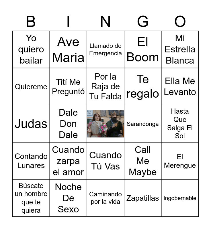 This bingo card has a free space and 25 words: Cuando zarpa el amor, Caminando por la vida, Por la Raja de Tu Falda, Búscate un hombre que te quiera, Mi Estrella Blanca, Yo quiero bailar, Quiereme, Ave Maria, Sarandonga, Cuando Tú Vas, Te regalo, Judas, Call Me Maybe, El Merengue, Tití Me Preguntó, Limbo, Hasta Que Salga El Sol, Llamado de Emergencia, Ella Me Levanto, Dale Don Dale, Ingobernable, Noche De Sexo, Contando Lunares, El Boom and Zapatillas.