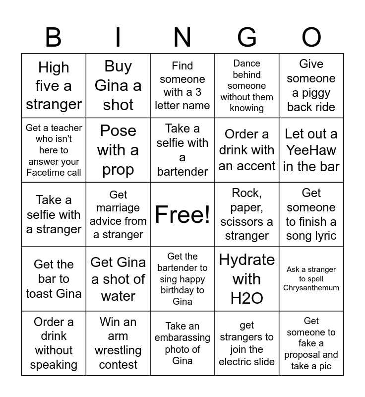 This bingo card has a free space and 24 words: Get Gina a shot of water, Win an arm wrestling contest, Take a selfie with a bartender, Order a drink without speaking, Give someone a piggy back ride, High five a stranger, Get a teacher who isn't here to answer your Facetime call, Buy Gina a shot, Rock, paper, scissors a stranger, Get the bartender to sing happy birthday to Gina, Order a drink with an accent, Take a selfie with a stranger, Hydrate with H2O, Ask a stranger to spell Chrysanthemum, Pose with a prop, get strangers to join the electric slide, Get someone to finish a song lyric, Find someone with a 3 letter name, Let out a YeeHaw in the bar, Get marriage advice from a stranger, Get someone to fake a proposal and take a pic, Get the bar to toast Gina, Dance behind someone without them knowing and Take an embarassing photo of Gina.