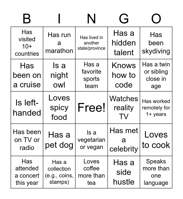 This bingo card has a free space and 50 words: Has completed a DIY home project, Speaks more than one language, Has traveled to another continent, Loves coffee more than tea, Has a pet dog, Has a pet cat, Has run a marathon, Plays a musical instrument, Has been on a cruise, Is a morning person, Is a night owl, Has a hidden talent, Loves to cook, Has met a celebrity, Has worked in another industry, Enjoys hiking, Has a favorite sports team, Watches reality TV, Reads 10+ books a year, Has been skydiving, Loves spicy food, Has a side hustle, Has visited 10+ countries, Knows how to code, Has a phobia, Enjoys gardening, Has a twin or sibling close in age, Loves board games, Has lived in another state/province, Is a vegetarian or vegan, Has a tattoo, Enjoys yoga or meditation, Has been in a play or musical, Loves sci-fi movies, Has a collection (e.g., coins, stamps), Has volunteered recently, Enjoys photography, Has a birthday this month, Knows a magic trick, Has worked remotely for 1+ years, Loves karaoke, Has a favorite podcast, Enjoys camping, Has a unique hobby, Has attended a concert this year, Is left-handed, Has a nickname, Loves to bake, Has been on TV or radio and Enjoys puzzles or crosswords.