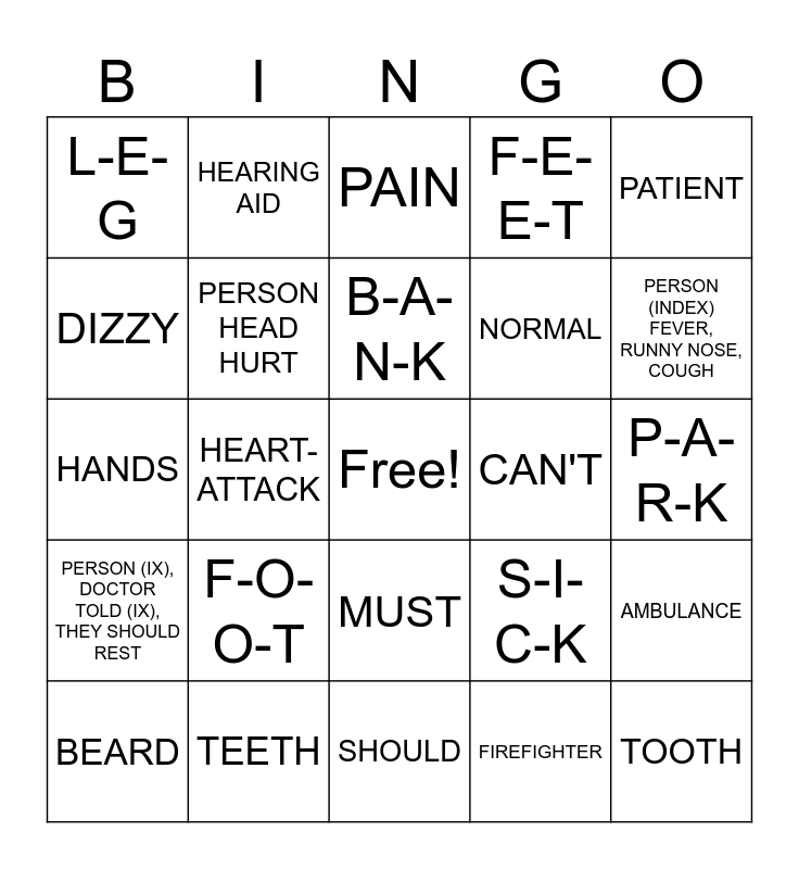 This bingo card has a free space and 34 words: HOSPITAL, FIREFIGHTER, STOMACH, NOT-YET, PERSON (IX), DOCTOR TOLD (IX), THEY SHOULD REST, PERSON HEAD HURT, PATIENT, BEARD, HEARING AID, DRAW-BLOOD, B-A-N-K, PAIN, PERSON FEEL SICK, EYES, CAN'T, PERSON (INDEX) FEVER, RUNNY NOSE, COUGH, TEETH, HANDS, F-O-O-T, S-I-C-K, MUST, NOW, PERSON FEEL HEATHY, L-E-G, P-A-R-K, SHOULD, TOOTH, F-E-E-T, COUGH, NORMAL, DIZZY, PREGNANT, HEART-ATTACK, AMBULANCE and HURRY.