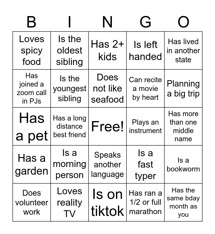 This bingo card has a free space and 24 words: Is a morning person, Loves reality TV, Does not like seafood, Does volunteer work, Has lived in another state, Loves spicy food, Has joined a zoom call in PJs, Is the oldest sibling, Plays an instrument, Speaks another language, Can recite a movie by heart, Has a pet, Is a fast typer, Is a bookworm, Is the youngest sibling, Has ran a 1/2 or full marathon, Has more than one middle name, Has 2+ kids, Planning a big trip, Has a long distance best friend, Has the same bday month as you, Has a garden, Is left handed and Is on tiktok.