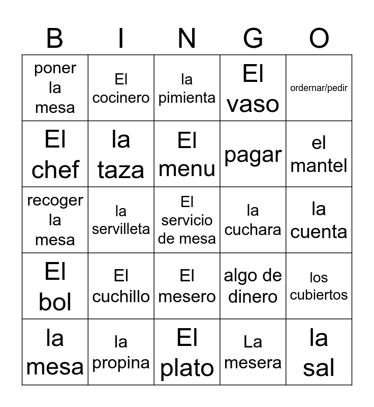 This bingo card has 26 words: El mesero, La mesera, El menu, la propina, ordernar/pedir, poner la mesa, El chef, El cocinero, la cuenta, algo de dinero, pagar, recoger la mesa, los cubiertos, la mesa, la servilleta, El tenedor, El vaso, El bol, la pimienta, El servicio de mesa, el mantel, El plato, la cuchara, El cuchillo, la taza and la sal.
