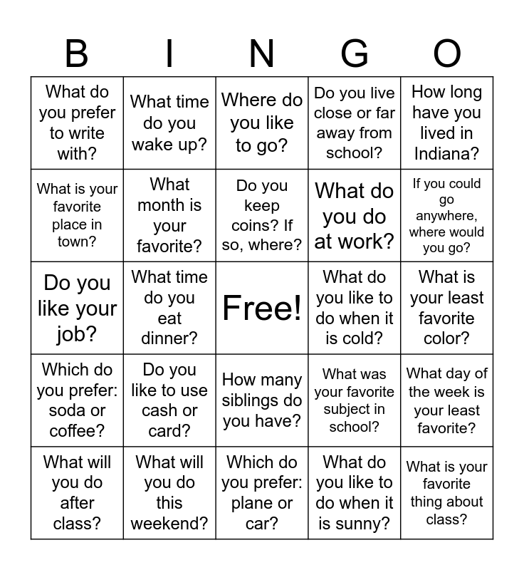 This bingo card has a free space and 24 words: Do you like to use cash or card?, What will you do this weekend?, Do you keep coins? If so, where?, What will you do after class?, How long have you lived in Indiana?, What do you prefer to write with?, What is your favorite place in town?, What time do you wake up?, What do you like to do when it is cold?, How many siblings do you have?, What do you do at work?, Do you like your job?, What was your favorite subject in school?, What day of the week is your least favorite?, What month is your favorite?, What do you like to do when it is sunny?, What is your least favorite color?, Where do you like to go?, If you could go anywhere, where would you go?, What time do you eat dinner?, What is your favorite thing about class?, Which do you prefer: soda or coffee?, Do you live close or far away from school? and Which do you prefer: plane or car?.