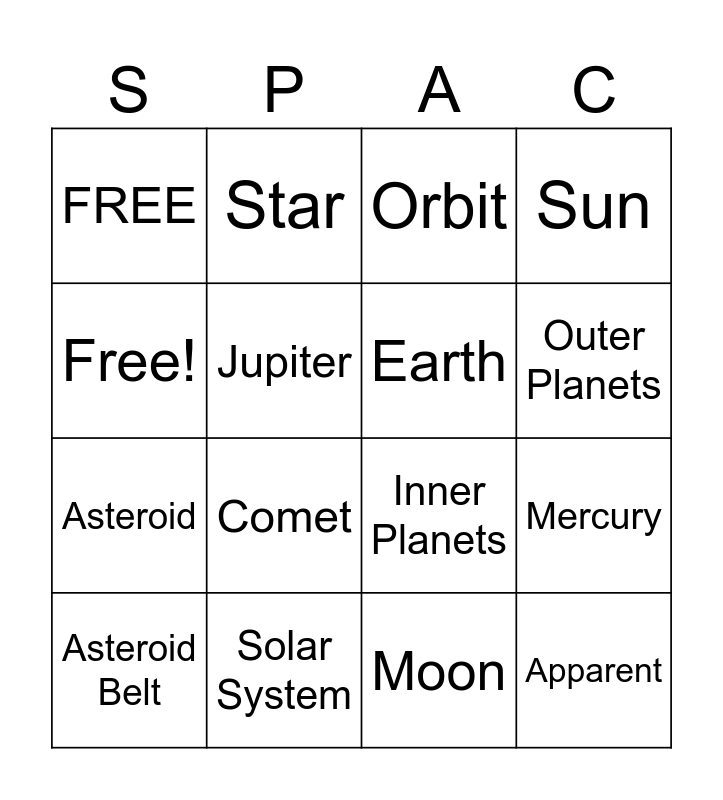 This bingo card has 16 words: Solar System, Mercury, Orbit, FREE, Asteroid, Star, Inner Planets, Moon, Free!, Jupiter, Asteroid Belt, Sun, Comet, Outer Planets, Earth and Apparent.