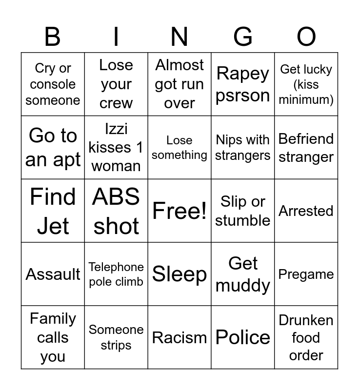 This bingo card has a free space and 24 words: Telephone pole climb, Someone strips, Lose something, Family calls you, Get lucky (kiss minimum), Cry or console someone, Go to an apt, Lose your crew, Slip or stumble, Sleep, Nips with strangers, Find Jet, Get muddy, Pregame, Izzi kisses 1 woman, Police, Arrested, Almost got run over, Befriend stranger, ABS shot, Drunken food order, Assault, Rapey psrson and Racism.