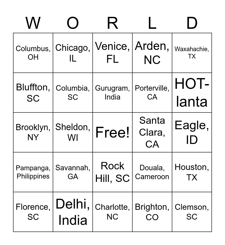 This bingo card has a free space and 31 words: Charlotte, NC, Philadelphia, PA, Sheldon, WI, Cincinnati, OH, Columbus, OH, Venice, FL, Columbia, SC, Douala, Cameroon, Santa Clara, CA, Brighton, CO, Eagle, ID, Clemson, SC, Muskegon, MI, Salem, OR, HOT-lanta, Mansfield, TX, Houston, TX, Savannah, GA, Pampanga, Philippines, Rock Hill, SC, Waxahachie, TX, Hurst, TX, Florence, SC, Chicago, IL, Porterville, CA, Bluffton, SC, Arden, NC, Brooklyn, NY, Delhi, India, Gurugram, India and West Down, England.