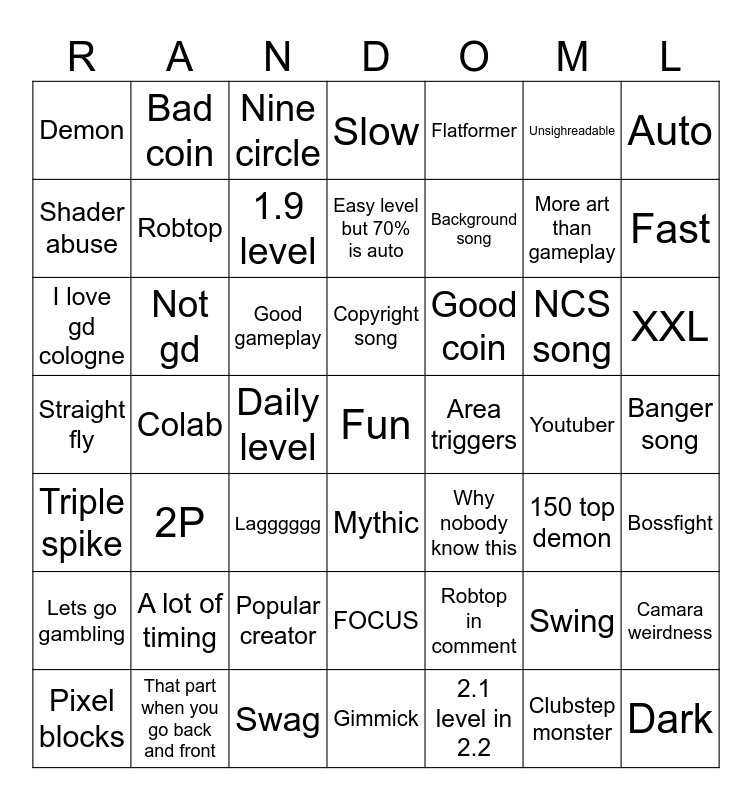 This bingo card has 49 words: Swing, More art than gameplay, 2.1 level in 2.2, Colab, Good gameplay, Banger song, Bad coin, Swag, Unsighreadable, Mythic, Auto, Slow, NCS song, Good coin, A lot of timing, Youtuber, Shader abuse, Fast, Camara weirdness, Flatformer, Background song, Daily level, Demon, Robtop, Pixel blocks, 1.9 level, XXL, That part when you go back and front, Copyright song, Not gd, Dark, Area triggers, Lets go gambling, Popular creator, Straight fly, Why nobody know this, 150 top demon, Bossfight, I love gd cologne, Lagggggg, FOCUS, Triple spike, Fun, Gimmick, Easy level but 70% is auto, Nine circle, Robtop in comment, 2P and Clubstep monster.