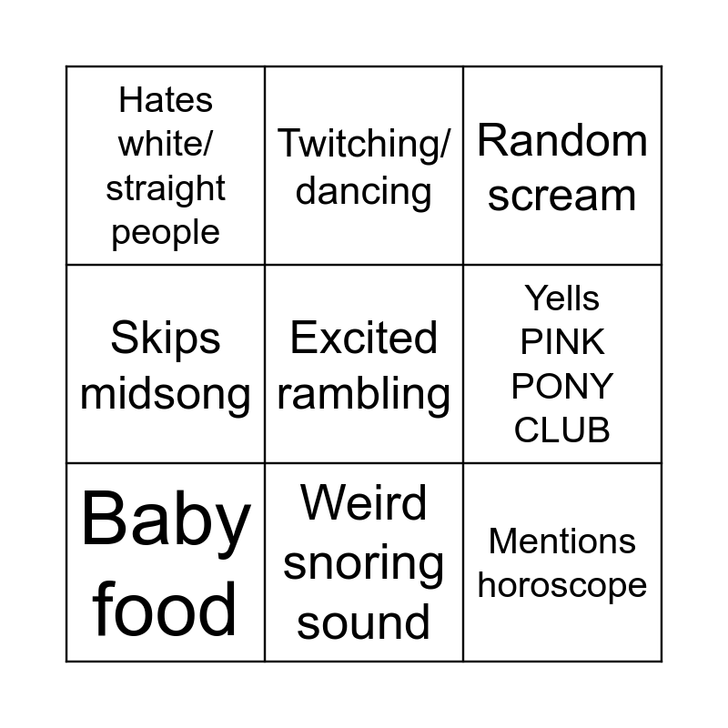 This bingo card has a free space and 8 words: Yells PINK PONY CLUB, Random scream, Twitching/ dancing, Baby food, Hates white/ straight people, Mentions horoscope, Skips midsong and Weird snoring sound.