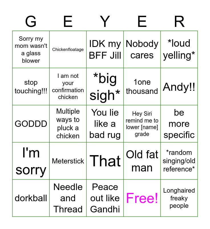 This bingo card has 30 words: Needle and Thread, State law compels me, Multiple ways to pluck a chicken, Money chicken, Sorry my mom wasn't a glass blower, IDK my BFF Jill, I am not your confirmation chicken, That, Hey Siri remind me to lower [name] grade, Peace out like Gandhi, be more specific, You lie like a bad rug, Free!, Longhaired freaky people, Andy!!, Wide load coming through, Old fat man, I'm sorry, Meterstick, *loud yelling*, GODDD, *intense eye contact*, Chickenfloatage, 1one thousand, stop touching!!!, Nobody cares, *random singing/old reference*, dorkball, *big sigh* and Do you want homework?.