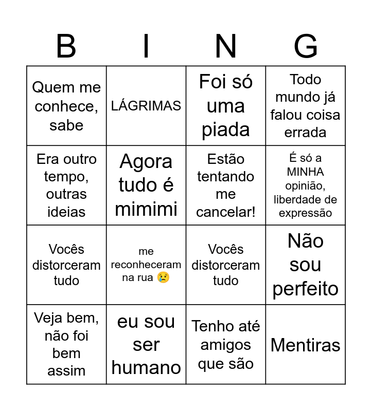 This bingo card has 16 words: eu sou ser humano, Não sou perfeito, Foi só uma piada, Quem me conhece, sabe, Vocês distorceram tudo, LÁGRIMAS, Vocês distorceram tudo, Tenho até amigos que são, Era outro tempo, outras ideias, Agora tudo é mimimi, Veja bem, não foi bem assim, Todo mundo já falou coisa errada, me reconheceram na rua 😢, É só a MINHA opinião, liberdade de expressão, Estão tentando me cancelar! and Mentiras.