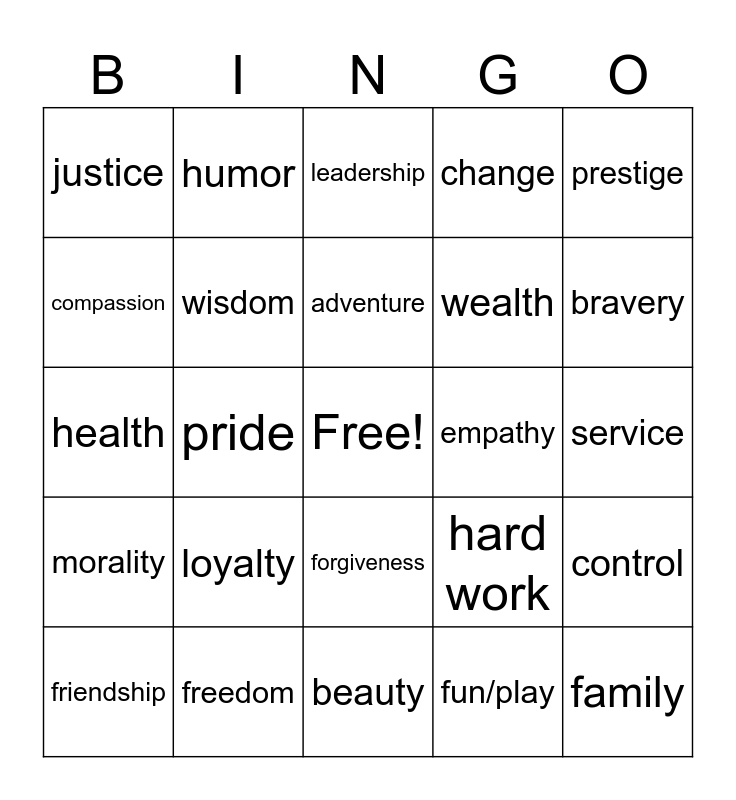 This bingo card has a free space and 24 words: loyalty, freedom, adventure, friendship, prestige, justice, compassion, humor, empathy, forgiveness, wealth, health, hard work, control, wisdom, fun/play, service, leadership, bravery, pride, family, morality, change and beauty.