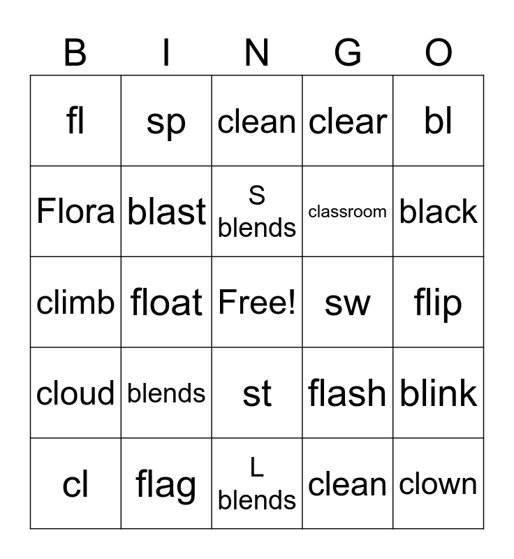 This bingo card has a free space and 25 words: blends, L blends, S blends, cl, bl, fl, Flora, sp, sw, st, classroom, climb, flash, blink, blast, blind, flip, clean, black, float, clown, flag, cloud, clear and clean.