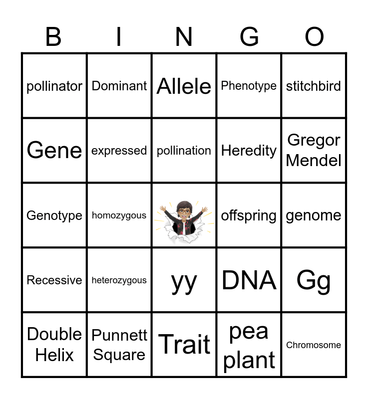 This bingo card has a free space and 27 words: DNA, Genetics, Heredity, Trait, Gene, Allele, Dominant, Recessive, offspring, Gg, Genotype, Phenotype, Double Helix, Punnett Square, Gregor Mendel, clone, expressed, pollination, heterozygous, pollinator, genome, pea plant, homozygous, Chromosome, yy, stitchbird and asexual reproduction.