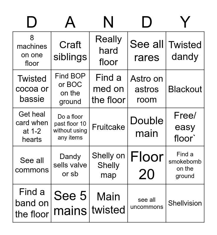 This bingo card has 25 words: Dandy sells valve or sb, Main twisted, Find a med on the floor, Find a band on the floor, Twisted dandy, 8 machines on one floor, Twisted cocoa or bassie, Craft siblings, Double main, Shelly on Shelly map, Astro on astros room, Get heal card when at 1-2 hearts, Floor 20, Find a smokebomb on the ground, Find BOP or BOC on the ground, Shellvision, Free/ easy floor`, Really hard floor, Blackout, Do a floor past floor 10 without using any items, Fruitcake, See 5 mains, See all commons, See all rares and see all uncommons.