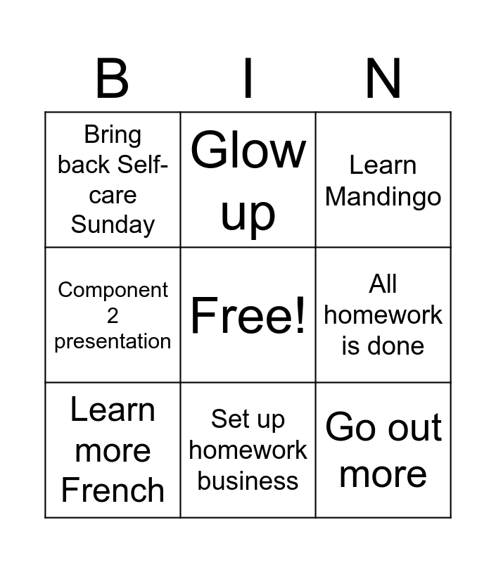 This bingo card has a free space and 8 words: All homework is done, Learn Mandingo, Glow up, Learn more French, Bring back Self-care Sunday, Go out more, Component 2 presentation and Set up homework business.