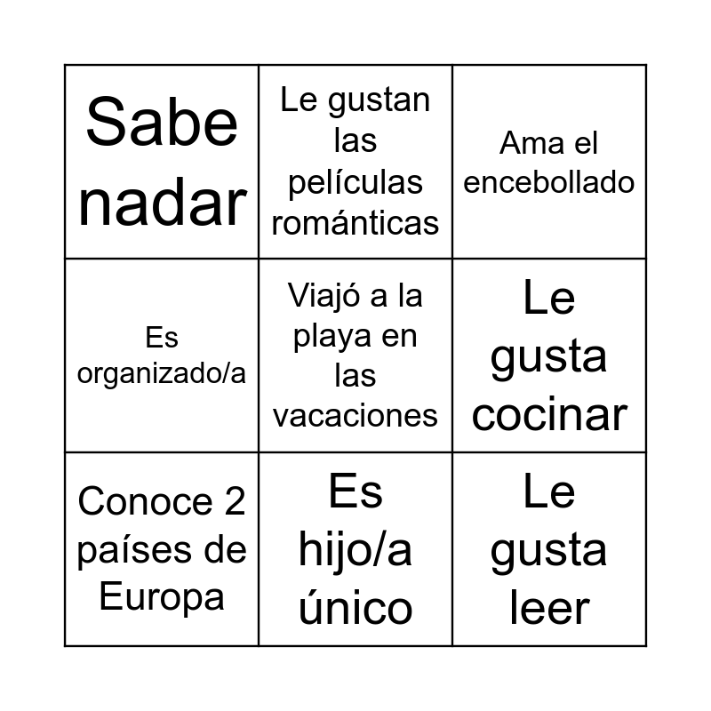 This bingo card has a free space and 11 words: Habla 2 idiomas, Es hijo/a único, Le gusta leer, Conoce 2 países de Europa, Le gustan las películas románticas, Ama el encebollado, Le gusta cocinar, No tiene Tik Tok, Es organizado/a, Sabe nadar and Toca un instrumento musical.