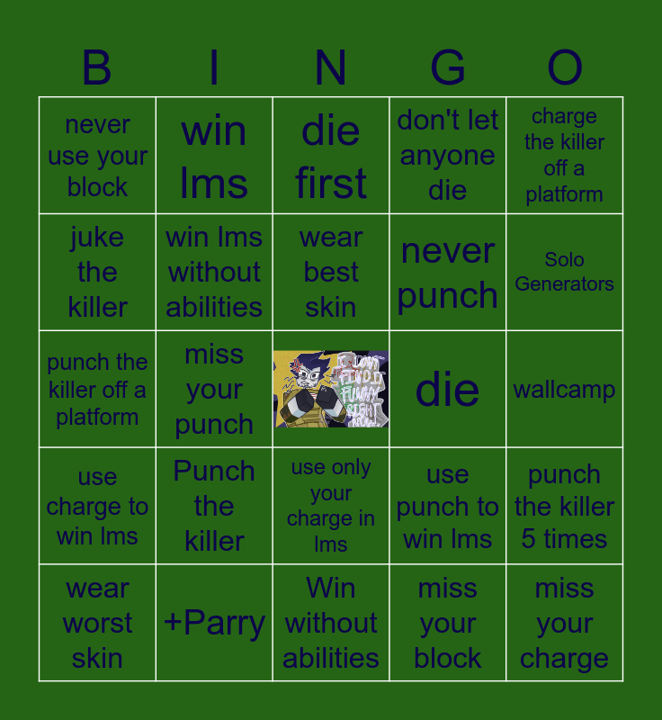 This bingo card has a free space and 24 words: Punch the killer, +Parry, wear best skin, wear worst skin, charge the killer off a platform, never use your block, juke the killer, win lms, die, use only your charge in lms, never punch, punch the killer off a platform, use punch to win lms, punch the killer 5 times, win lms without abilities, miss your block, wallcamp, die first, Solo Generators, miss your punch, miss your charge, use charge to win lms, don't let anyone die and Win without abilities.