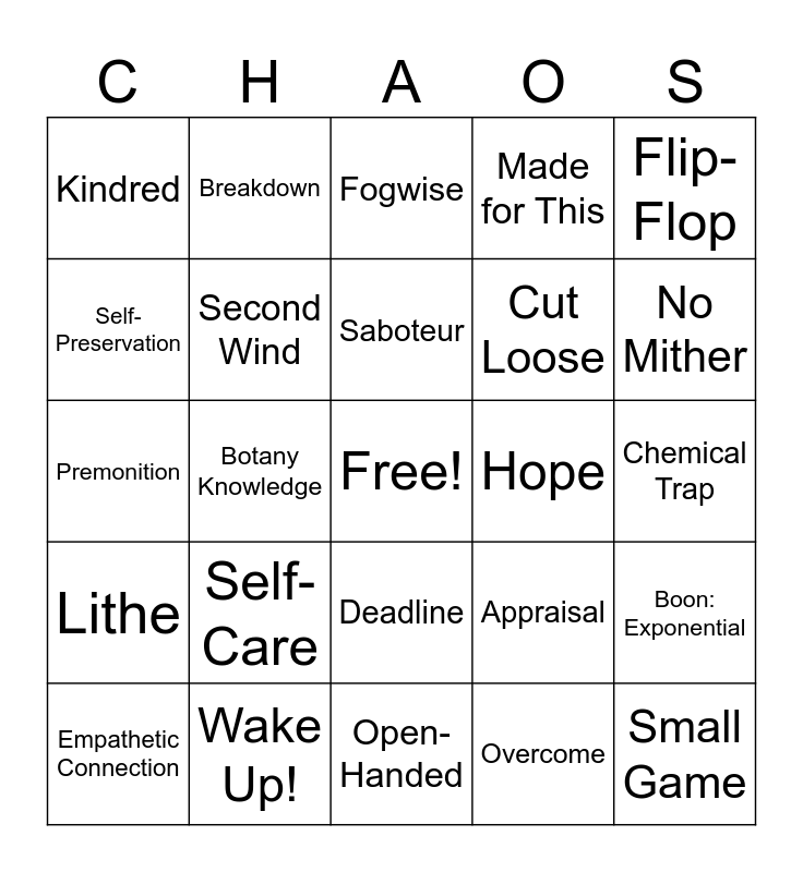 This bingo card has a free space and 149 words: Ace in the Hole, Adrenaline, Aftercare, Alert, Any Means Necessary, Appraisal, Autodidact, Babysitter, Background Player, Balanced Landing, Bardic Inspiration, Better Together, Better than New, Bite the Bullet, Blast Mine, Blood Pact, Blood Rush, Boil Over, Bond, Boon: Circle of Healing, Boon: Dark Theory, Boon: Exponential, Boon: Illumination, Boon: Shadow Step, Borrowed Time, Botany Knowledge, Breakdown, Breakout, Buckle Up, Built to Last, Calm Spirit, Camaraderie, Champion of Light, Chemical Trap, Clairvoyance, Clean Break, Corrective Action, Counterforce, Cut Loose, Dance With Me, Dark Sense, Dead Hard, Deadline, Deception, Decisive Strike, Deja Vu, Deliverance, Desperate Measures, Detective's Hunch, Distortion, Diversion, Dramaturgy, Empathetic Connection, Empathy, Exultation, Eyes of Belmont, Fast Track, Finesse, Fixated, Flashbang, Flip-Flop, Fogwise, For the People, Friendly Competition, Hardended, Head On, Hope, Hyperfocus, Inner Focus, Inner Strength, Invocation: Treacherous Crows, Invocation: Weaving Spiders, Iron Will, Kindred, Leader, Left Behind, Light-Footed, Lightweight, Lithe, Low Profile, Lucky Break, Lucky Star, Made for This, Mettle of Man, Mirrored Illusion, Moment of Glory, No Mither, No One Left Behind, Object of Obsession, Off the Record, Open-Handed, Overcome, Overzealous, Parental Guidance, Pharmacy, Plot Twist, Plunderer's Instinct, Poised, Potential Energy, Power Struggle, Premonition, Prove Thyself, Quick & Quiet, Quick Gambit, Reactive Healing, Reassurance, Red Herring, Repressed Alliance, Residual Manifest, Resilience, Resurgence, Rookie Spirit, Saboteur, Scavenger, Scene Partner, Second Wind, Self-Care, Self-Preservation, Shoulder the Burden, Slippery Meat, Small Game, Smash Hit, Sole Survivor, Solidarity, Soul Guard, Specialist, Spine Chill, Sprint Burst, Stake Out, Still Sight, Streetwise, Strength in Shadows, Teamwork: Collective Strength, Teamwork: Power of Two, Technician, Tenacity, This Is Not Happening, Troubleshooter, Unbreakable, Up the Ante, Urban Evasion, Vigil, Visionary, Wake Up!, We'll Make It, We're Gonna Live Forever, Wicked, Windows of Opportunity and Wiretap.