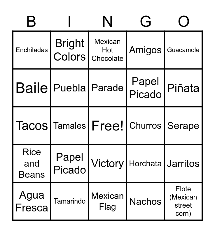 This bingo card has a free space and 35 words: Fiesta, Cinco, Gracias, Puebla, Victory, Amigos, Baile, Feliz, Parade, Confetti, Tacos, Guacamole, Salsa, Quesadilla, Enchiladas, Churros, Nachos, Tamales, Rice and Beans, Elote (Mexican street corn), Horchata, Agua Fresca, Jarritos, Tamarindo, Mexican Hot Chocolate, Piñata, Sombrero, Maracas, Papel Picado, Serape, Poncho, Mexican Flag, Papel Picado, Bright Colors and Cactus.