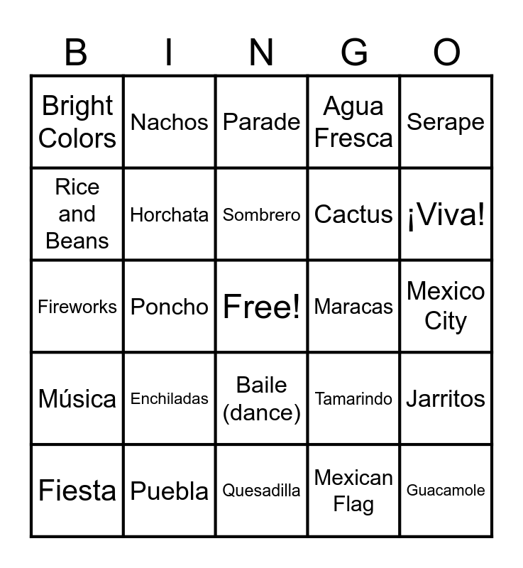 This bingo card has a free space and 48 words: Tacos, Guacamole, Salsa, Quesadilla, Enchiladas, Churros, Nachos, Tamales, Rice and Beans, Elote (Mexican street corn), Horchata, Agua Fresca, Jarritos, Tamarindo, Mexican Hot Chocolate, Piñata, Sombrero, Maracas, Papel Picado, Serape, Poncho, Mexican Flag, Bright Colors, Cactus, ¡Olé!, ¡Viva!, Fiesta, Amigos, Baile (dance), Música, Feliz, Cinco, Gracias, Celebración, Puebla, Battle of Puebla, General Zaragoza, Mexico City, Independence, France, Victory, Revolution, Parade, Dancers, Fireworks, Confetti, Decorations and Celebration.