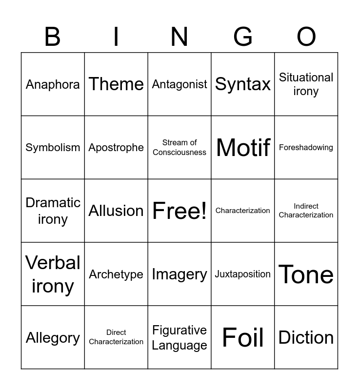 This bingo card has a free space and 29 words: Allegory, Alliteration, Allusion, Ambiguity, Anaphora, Antagonist, Apostrophe, Archetype, Characterization, Direct Characterization, Indirect Characterization, Diction, Figurative Language, Foil, Foreshadowing, Hyperbole, Imagery, Verbal irony, Situational irony, Dramatic irony, Juxtaposition, Metaphor, Motif, Symbolism, Syntax, Theme, Tone, Stream of Consciousness and Epigraph.