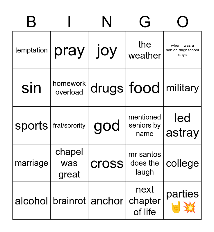 This bingo card has a free space and 24 words: chapel was great, brainrot, drugs, alcohol, when i was a senior../highschool days, temptation, sin, pray, mentioned seniors by name, cross, food, sports, mr santos does the laugh, college, homework overload, next chapter of life, led astray, joy, military, frat/sorority, parties 🤘💥, marriage, the weather and anchor.