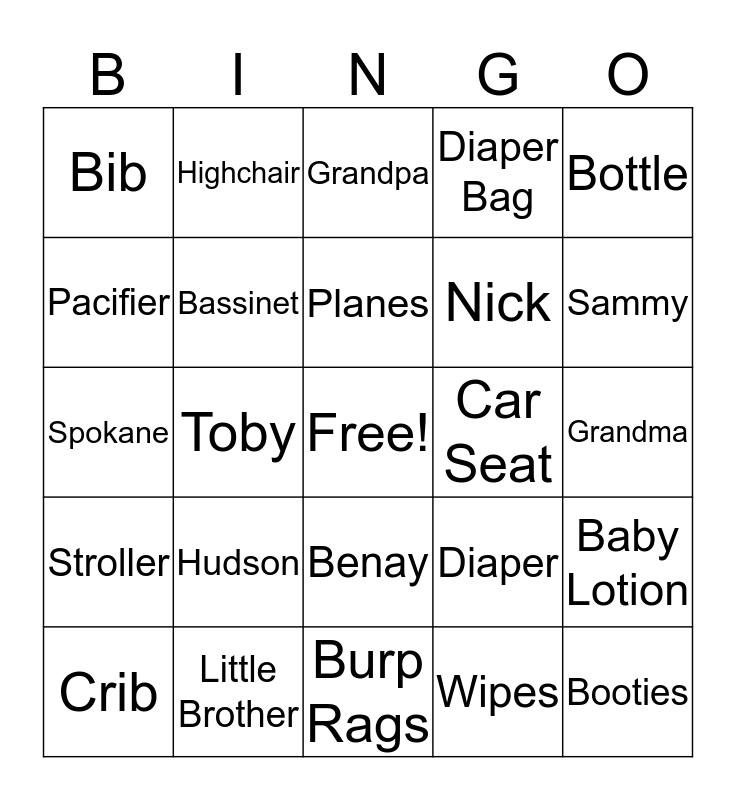 This bingo card has a free space and 24 words: Hudson, Little Brother, Planes, Crib, Bottle, Bib, Pacifier, Highchair, Car Seat, Benay, Nick, Spokane, Diaper, Baby Lotion, Bassinet, Wipes, Grandma, Grandpa, Sammy, Toby, Booties, Stroller, Diaper Bag and Burp Rags.