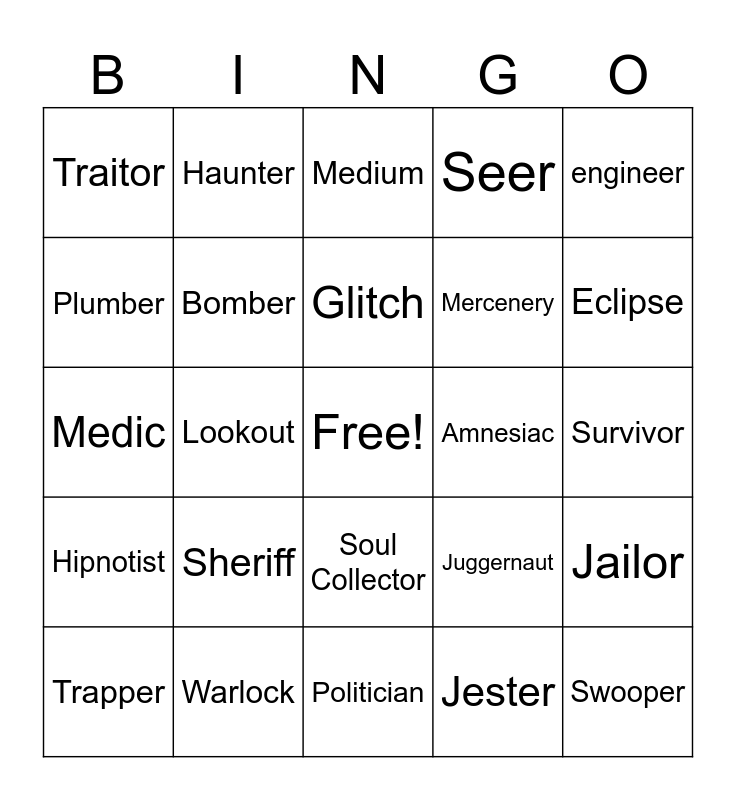 This bingo card has a free space and 24 words: Sheriff, Warlock, Glitch, Trapper, engineer, Traitor, Plumber, Haunter, Amnesiac, Soul Collector, Mercenery, Medic, Juggernaut, Jailor, Bomber, Jester, Survivor, Medium, Eclipse, Lookout, Swooper, Hipnotist, Seer and Politician.