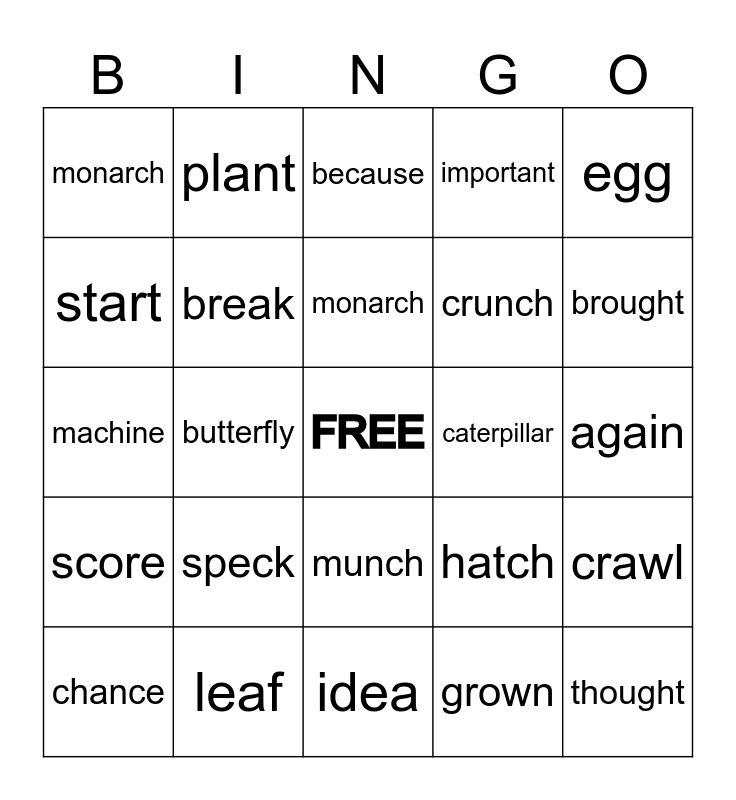 This bingo card has a free space and 24 words: speck, leaf, monarch, chance, egg, monarch, start, plant, caterpillar, munch, crunch, machine, hatch, crawl, break, grown, again, because, brought, butterfly, thought, score, important and idea.