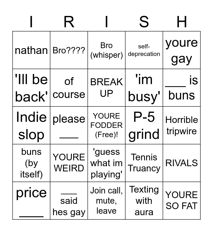 This bingo card has a free space and 24 words: YOURE WEIRD, ___ said hes gay, BREAK UP, price ___, youre gay, nathan, 'Ill be back', Bro????, P-5 grind, 'guess what im playing', 'im busy', Indie slop, Tennis Truancy, RIVALS, of course, Texting with aura, Horrible tripwire, Bro (whisper), ___ is buns, please ___, YOURE SO FAT, buns (by itself), self-deprecation and Join call, mute, leave.