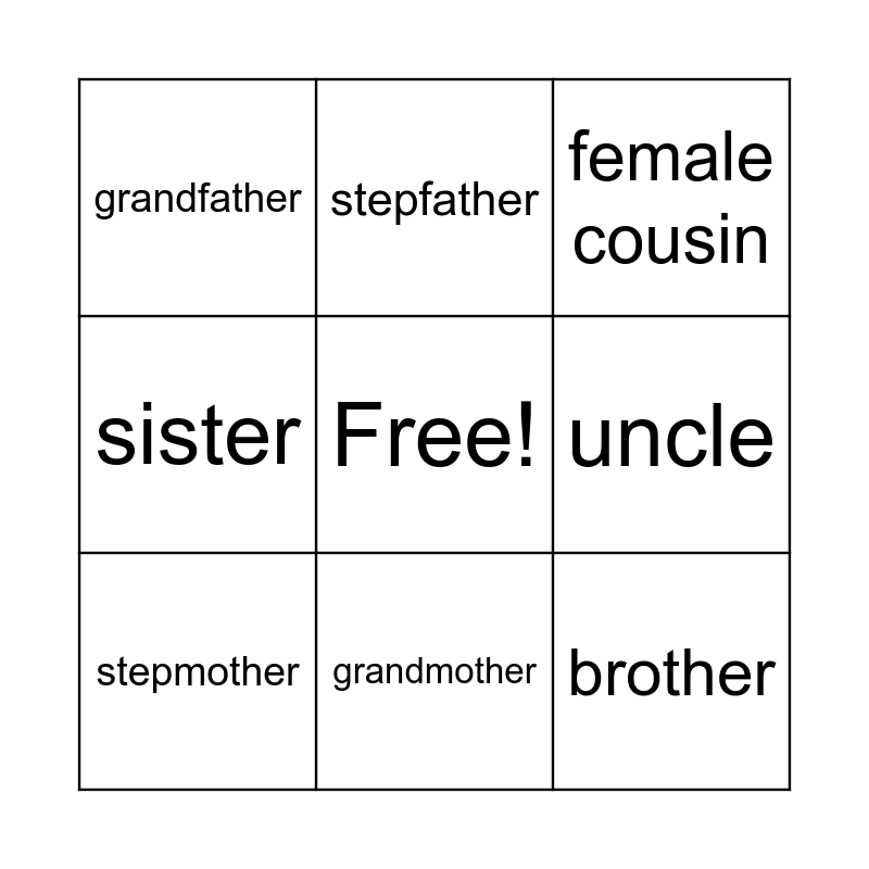 This bingo card has a free space and 14 words: mother, father, stepmother, stepfather, sister, brother, step/half sister, step/half brother, grandmother, grandfather, aunt, uncle, female cousin and male cousin.