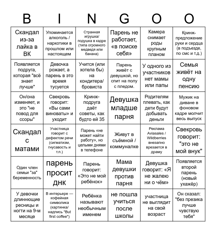 This bingo card has 36 words: Мама девушки против парня, Парень говорит: «Это не мой ребёнок», не пошла учиться после школы, Появляется подруга, которая "всё знает лучше", Скандал с матами, Девушка младше парня, Девочка рожает, а парень в это время тусуется, Ребёнка называют необычным именем, Камера снимает роды крупным планом, Девушка говорит: «Я не жалею ни о чём», Семья живёт на одну пенсию, Парень не работает, «в поиске себя», Появляется второй парень (новый ухажёр), Свекровь говорит: «Вы сами виноваты» и уходит, Парень живёт с девушкой, но спит на полу с пледом., Скандал из-за лайка в ВК, Один член семьи "за" беременность, Родителям плевать, как дети будут добывать деньги, Он/она изменяет, и это "не повод для ссоры", Странная игрушка/подушка в кадре (типа огромного медведя или банана), Кринж-подруга даёт советы, как будто ей 35, Участница говорит с дефектом речи (сигматизм, гнусавость и т.п.), Живут в съёмной / коммуналке, Парень «не может найти работу», но целыми днями в телефоне, Реклама Aviasales / Wildberries внезапно врезается в драму, Упоминается алкоголь / наркотики в прошлом или настоящем, У одного из участников нет мамы или папы, В интерьере — кофейная символика (картинка/надпись "But first coffee"), Учится (или хотела бы) на кондитера/бровиста, Кринж-предложение руки и сердца (в подъезде, по смс и т.д.), Он сказал: "без презика лучше чувствую тебя", У девочки длиннющие ресницы и ногти на 9-м месяце, Свекровь говорит: "это не мой внук", Мужик на диване в фоновом кадре молчит весь выпуск, парень просит днк and участница не выглядит на свой возраст.