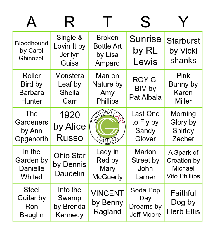 This bingo card has a free space and 31 words: Peridot by Lisa Eikenberry, Into the Swamp by Brenda Kennedy, Man on Nature by Amy Phillips, Seeing Rainbows by Laura Hunter-Null, Starburst by Vicki shanks, Bloodhound by Carol Ghinozoli, 1920 by Alice Russo, VINCENT by Benny Ragland, ROY G. BIV by Pat Albala, Faithful Dog by Herb Ellis, Steel Guitar by Ron Baughn, Ohio Star by Dennis Daudelin, Soda Pop Day Dreams by Jeff Moore, Moonlit Marsh by Carol Cieslik, In the Garden by Danielle Whited, Doorways by Jim Riley, Lady in Red by Mary McGuerty, Last One to Fly by Sandy Glover, Morning Glory by Shirley Zecher, Moon Glow by Katrina Browning, Single & Lovin It by Jerilyn Guiss, Grapefruit in Graphite by Bob Ellis, Marion Street by John Larner, Pink Bunny by Karen Miller, The Gardeners by Ann Opgenorth, Monstera Leaf by Sheila Carr, Broken Bottle Art by Lisa Amparo, Sunrise by RL Lewis, A Spark of Creation by Michael Vito Phillips, Roller Bird by Barbara Hunter and Porcelain & Feldspar by Janet Hans.