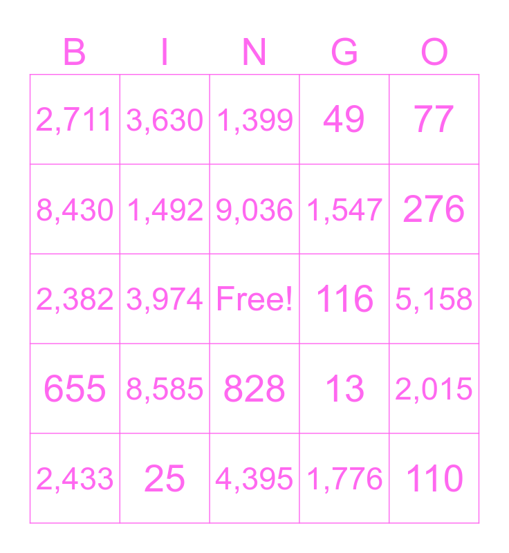 This bingo card has a free space and 24 words: 8,585, 25, 9,036, 2,433, 77, 2,711, 8,430, 3,630, 116, 828, 1,547, 2,382, 13, 2,015, 1,492, 1,776, 5,158, 1,399, 276, 3,974, 110, 655, 49 and 4,395.