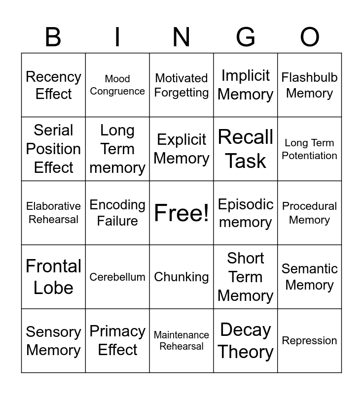 This bingo card has a free space and 24 words: Sensory Memory, Cerebellum, Explicit Memory, Decay Theory, Flashbulb Memory, Recency Effect, Mood Congruence, Motivated Forgetting, Episodic memory, Procedural Memory, Elaborative Rehearsal, Long Term memory, Short Term Memory, Semantic Memory, Serial Position Effect, Primacy Effect, Maintenance Rehearsal, Implicit Memory, Long Term Potentiation, Frontal Lobe, Encoding Failure, Chunking, Recall Task and Repression.