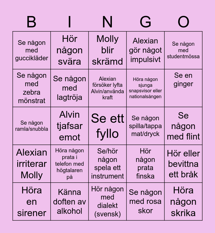 This bingo card has a free space and 24 words: Höra någon prata i telefon med högtalaren på, Känna doften av alkohol, Alexian försöker lyfta Alvin/använda kraft, Höra en sirener, Se någon med studentmössa, Se någon med guccikläder, Se någon med zebra mönstrat, Hör någon svära, Se någon spilla/tappa mat/dryck, Se/hör någon spela ett instrument, Höra någon sjunga snapsvisor eller nationalsången, Se någon ramla/snubbla, Hör någon prata finska, Hör eller bevittna ett bråk, Se någon med lagtröja, Se någon med rosa skor, Se någon med flint, Molly blir skrämd, Se en ginger, Alvin tjafsar emot, Höra någon skrika, Alexian irriterar Molly, Alexian gör något impulsivt and Hör någon med dialekt (svensk).