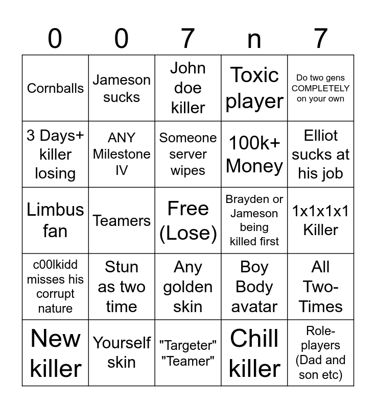 This bingo card has a free space and 24 words: Stun as two time, Yourself skin, Someone server wipes, New killer, Do two gens COMPLETELY on your own, Cornballs, 3 Days+ killer losing, Jameson sucks, Brayden or Jameson being killed first, Any golden skin, 100k+ Money, Limbus fan, Boy Body avatar, All Two-Times, ANY Milestone IV, Chill killer, 1x1x1x1 Killer, John doe killer, Elliot sucks at his job, Teamers, Role-players (Dad and son etc), c00lkidd misses his corrupt nature, Toxic player and "Targeter" "Teamer".