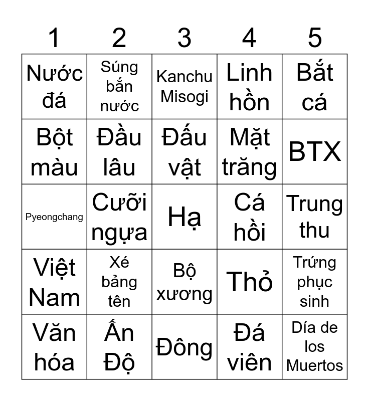 This bingo card has 49 words: Xuân, Hạ, Thu, Đông, Xé bảng tên, Mật thư, Súng bắn nước, Bóng nước, Bột màu, Múa lân, Đầu lâu, Linh hồn, Trứng phục sinh, Thỏ, Ngựa, Bánh trung thu, Đấu vật, Cá hồi, Xà phòng, Bắt cá, Cưỡi ngựa, Đá viên, Nước đá, Mặt trăng, ICC, BTX, Văn hóa, Đồng đội, Bộ xương, Việt Nam, Nhật Bản, Hàn Quốc, Mexico, Israel, Ấn Độ, Thái Lan, Mông Cổ, Seasonal Odyssey, Trung thu, Naadam, Songkran, Holi, Día de los Muertos, Lễ hội mùa xuân, Pyeongchang, Kanchu Misogi, Lễ hội, Ném bột and Tạt nước.