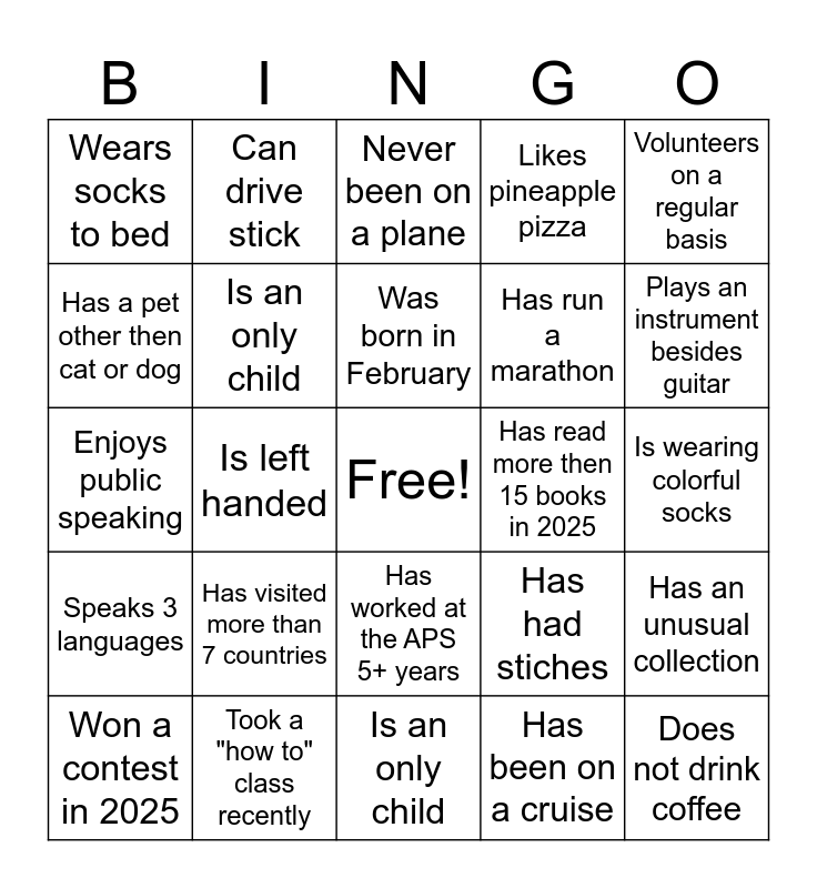 This bingo card has a free space and 39 words: Knows how to surf, In a sports league, Has gone skydiving, Is an only child, Won a contest in 2025, Has worked at the APS 5+ years, Was born in February, Has met a celebrity, Volunteers on a regular basis, Speaks 3 languages, Is left handed, Likes pineapple pizza, Does not drink coffee, Is wearing colorful socks, Has read more then 15 books in 2025, Has visited more than 7 countries, Has a non-nut allergy, Wears socks to bed, Walks to work, Has had stiches, Has a pet other then cat or dog, Is an only child, Has run a marathon, Plays an instrument besides guitar, Has lived in another country, Has gone on a hot air balloon, Has a feature article on them, Knows ASL, Taught a class, Can drive stick, Has 0 unread emails, Is a vegetarian, Never been on a plane, Took a "how to" class recently, Has been on a cruise, Knows how to surf, Has an unusual collection, Enjoys public speaking and Held a snake.
