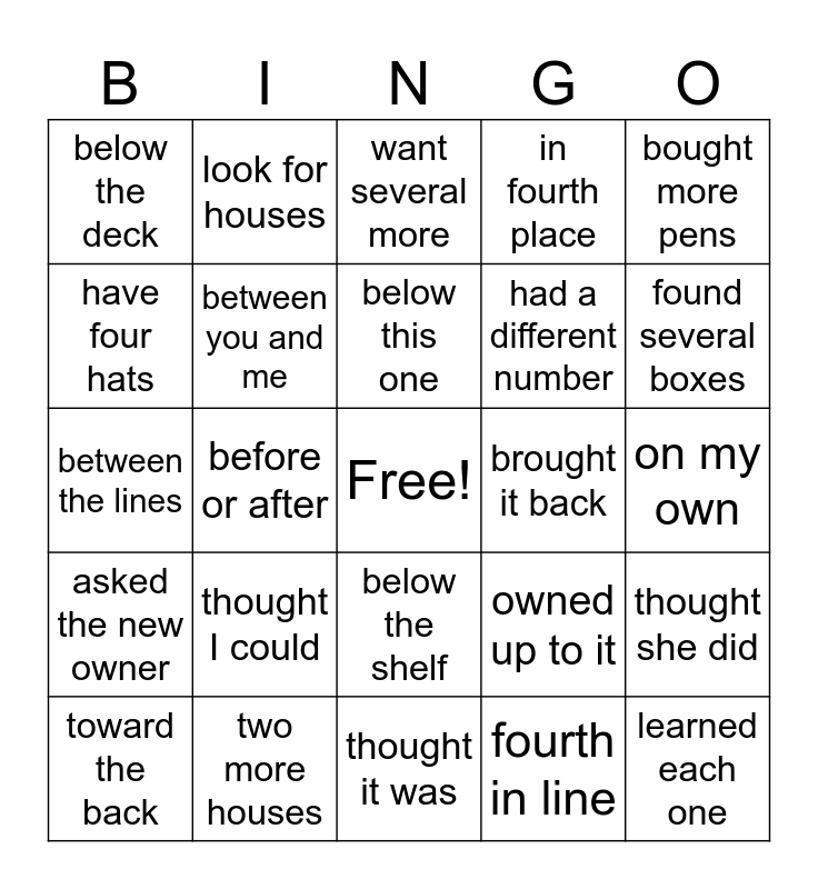 This bingo card has a free space and 29 words: toward the back, will learn to walk, before or after, went a different way, below the deck, want several more, between you and me, thought I could, brought it back, two more houses, on my own, learned each one, thought it was, fourth in line, found several boxes, is the owner, below the shelf, asked the new owner, bought more pens, between the lines, owned up to it, toward the right, had a different number, have four hats, in fourth place, look for houses, thought she did, below this one and toward the right.