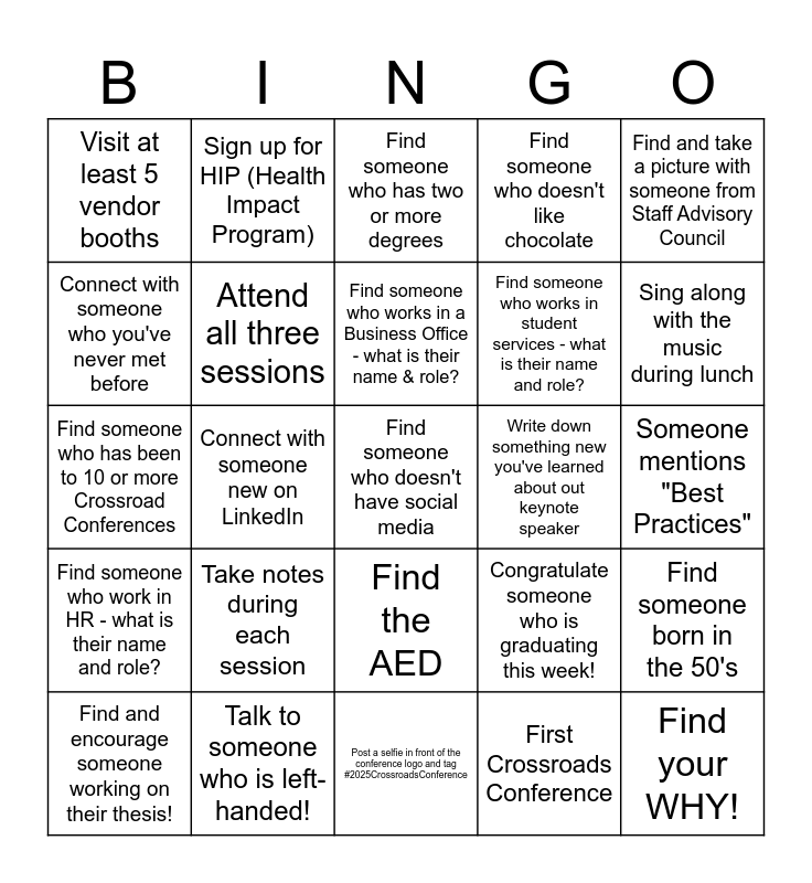 This bingo card has 30 words: Talk to someone who is left-handed!, Identify the person who has been working at the UA the longest, Connect with someone new on LinkedIn, Find someone who has a twin, Visit at least 5 vendor booths, Find someone who has two or more degrees, Attend all three sessions, Find the AED, Write down something new you've learned about out keynote speaker, Post a selfie in front of the conference logo and tag #2025CrossroadsConference, Someone mentions "Best Practices", Find someone who doesn't have social media, First Crossroads Conference, Find your WHY!, Sing along with the music during lunch, Technical issues during a session, Congratulate someone who is graduating this week!, Find someone who work in HR - what is their name and role?, Take notes during each session, Find and take a picture with someone from Staff Advisory Council, Find someone who has been to 10 or more Crossroad Conferences, Set a new career goal, Sign up for HIP (Health Impact Program), Find someone who works in student services - what is their name and role?, Connect with someone who you've never met before, Find someone who doesn't like chocolate, Find someone born in the 50's, Find and encourage someone working on their thesis!, Find someone who works in a Business Office - what is their name & role? and Find someone who has traveled to another country in the last year.