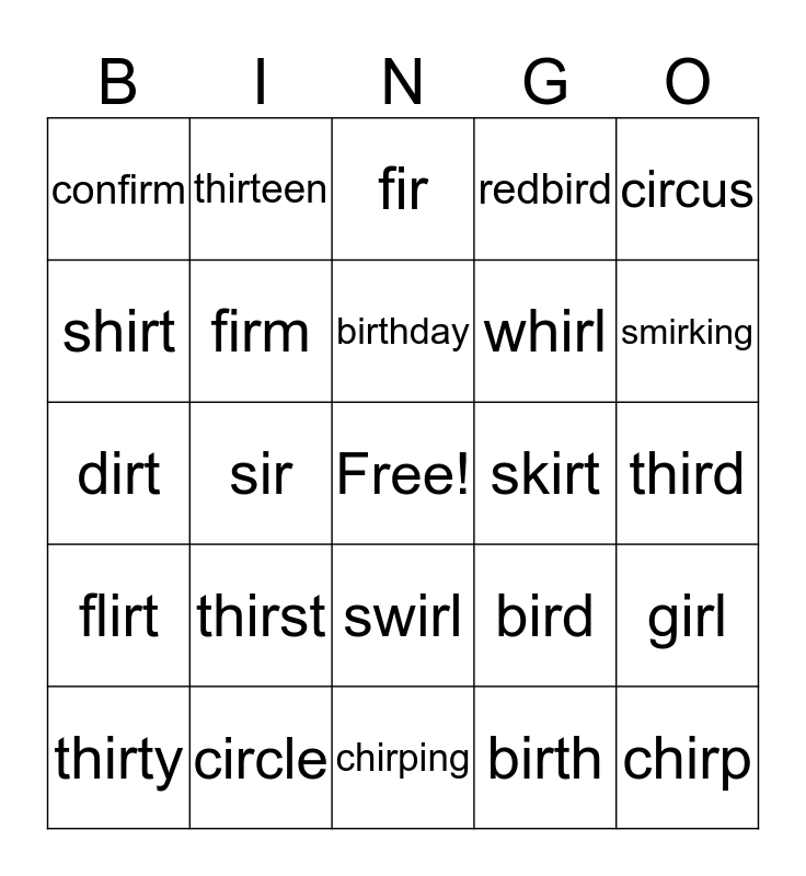 This bingo card has a free space and 24 words: thirst, circle, birthday, thirty, circus, confirm, shirt, thirteen, skirt, swirl, whirl, dirt, bird, girl, firm, birth, third, fir, smirking, sir, chirp, flirt, redbird and chirping.