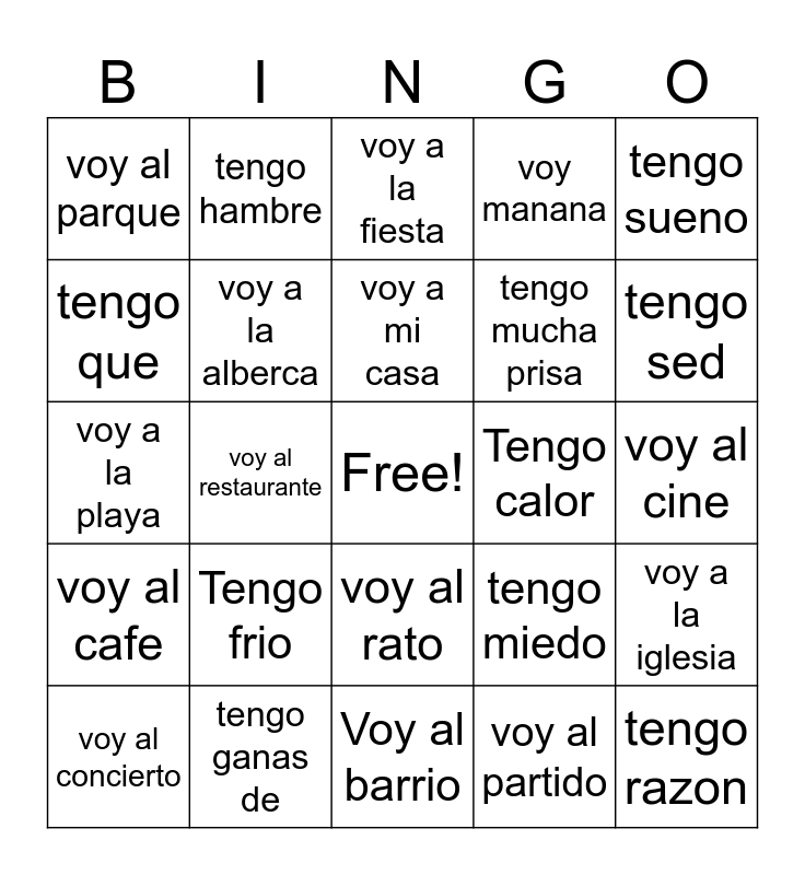 This bingo card has a free space and 24 words: voy al concierto, Tengo frio, voy a mi casa, voy al partido, tengo sueno, voy al parque, tengo hambre, voy a la fiesta, Tengo calor, voy al cine, voy a la playa, voy a la alberca, tengo miedo, voy a la iglesia, tengo que, tengo ganas de, Voy al barrio, voy manana, tengo sed, voy al cafe, voy al restaurante, voy al rato, tengo mucha prisa and tengo razon.