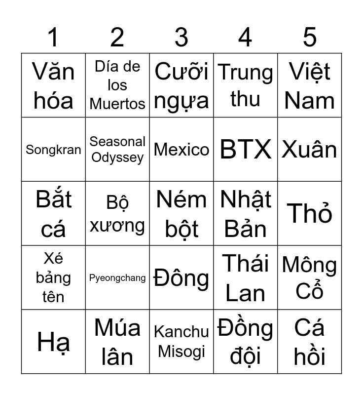 This bingo card has 49 words: Tạt nước, Ném bột, Lễ hội, Kanchu Misogi, Pyeongchang, Lễ hội mùa xuân, Día de los Muertos, Holi, Songkran, Naadam, Seasonal Odyssey, Trung thu, Mông Cổ, Thái Lan, Ấn Độ, Israel, Mexico, Nhật Bản, Hàn Quốc, Việt Nam, Bộ xương, Đồng đội, Văn hóa, BTX, ICC, Xuân, Hạ, Thu, Đông, Xé bảng tên, Mật thư, Súng bắn nước, Bóng nước, Bột màu, Múa lân, Linh hồn, Đầu lâu, Trứng phục sinh, Thỏ, Ngựa, Bánh trung thu, Đấu vật, Cá hồi, Xà phòng, Bắt cá, Cưỡi ngựa, Đá viên, Nước đá and Mặt trăng.