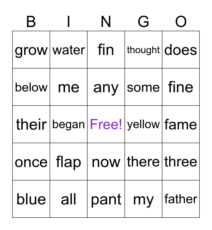 This bingo card has a free space and 24 words: flap, all, any, blue, does, grow, below, water, yellow, now, some, their, there, three, me, my, fame, fin, fine, began, father, once, thought and pant.
