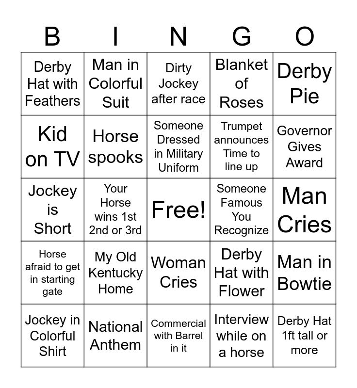 This bingo card has a free space and 24 words: My Old Kentucky Home, National Anthem, Someone Dressed in Military Uniform, Jockey in Colorful Shirt, Derby Pie, Derby Hat with Feathers, Kid on TV, Man in Colorful Suit, Someone Famous You Recognize, Woman Cries, Trumpet announces Time to line up, Jockey is Short, Derby Hat with Flower, Man in Bowtie, Horse spooks, Interview while on a horse, Man Cries, Dirty Jockey after race, Governor Gives Award, Your Horse wins 1st 2nd or 3rd, Derby Hat 1ft tall or more, Horse afraid to get in starting gate, Blanket of Roses and Commercial with Barrel in it.