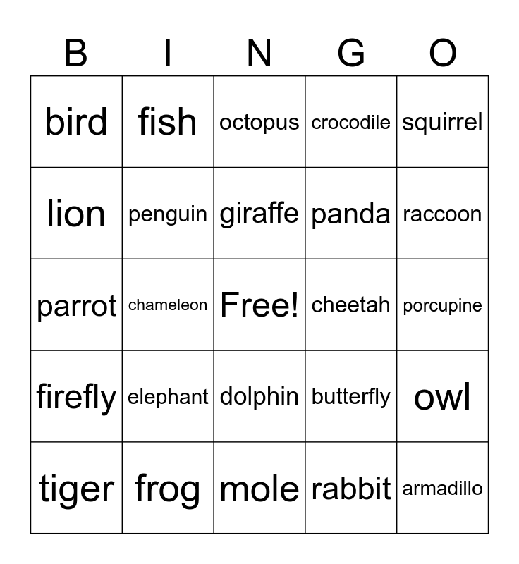 This bingo card has a free space and 24 words: elephant, frog, giraffe, tiger, squirrel, bird, lion, fish, cheetah, dolphin, panda, parrot, butterfly, owl, penguin, rabbit, porcupine, octopus, raccoon, chameleon, armadillo, firefly, crocodile and mole.