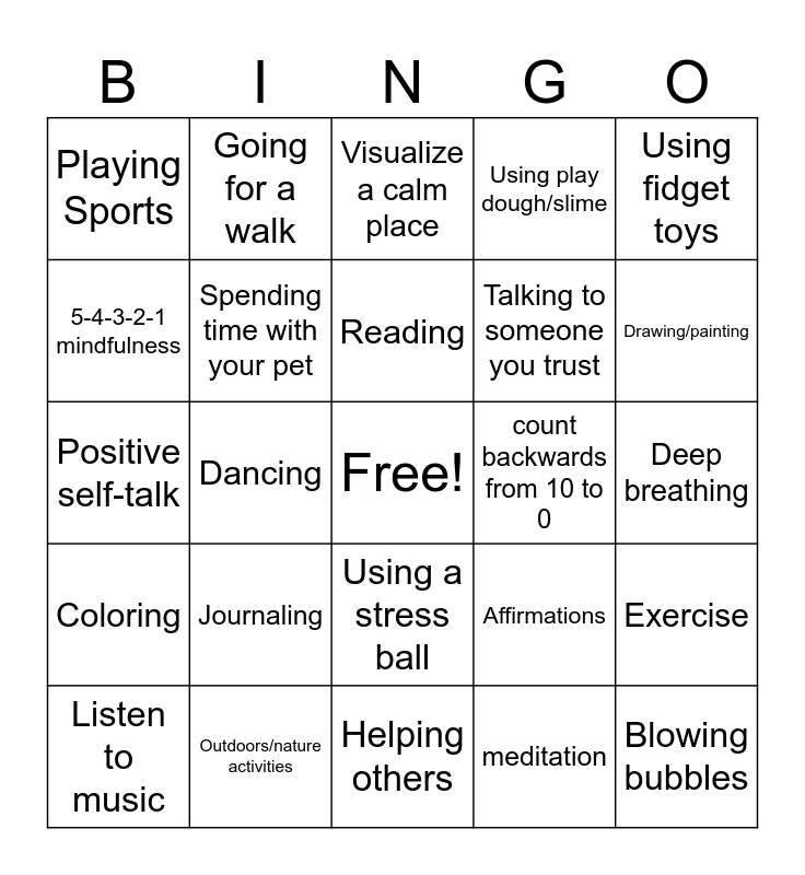 This bingo card has a free space and 24 words: Journaling, Outdoors/nature activities, Reading, Listen to music, Using fidget toys, Playing Sports, 5-4-3-2-1 mindfulness, Going for a walk, count backwards from 10 to 0, Using a stress ball, Talking to someone you trust, Positive self-talk, Affirmations, Exercise, Spending time with your pet, meditation, Deep breathing, Visualize a calm place, Drawing/painting, Dancing, Blowing bubbles, Coloring, Using play dough/slime and Helping others.